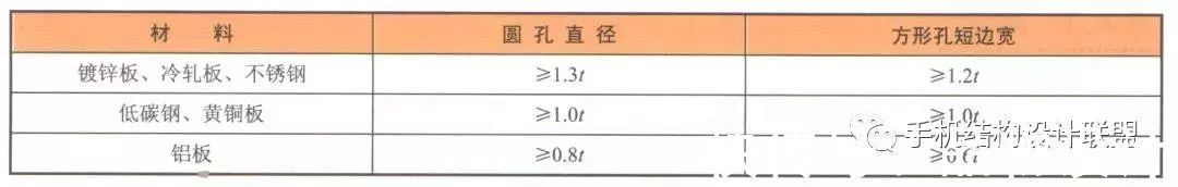 冲切件的孔优先选用圆孔,冲孔时,受到冲头强度的限制,冲孔的直径不能太小,不然容易损坏冲头。冲孔最小尺寸与孔的形状、材料机械性能和材料厚度有关,表1是常用材料最小的冲孔尺寸,t为钣金材料厚度。